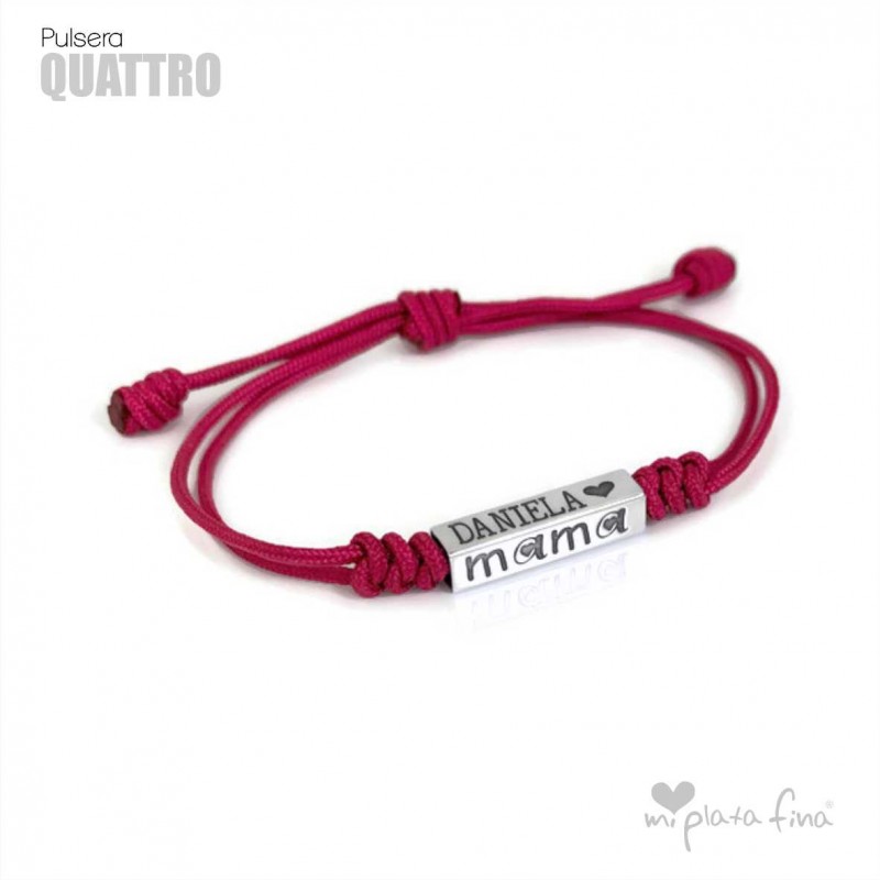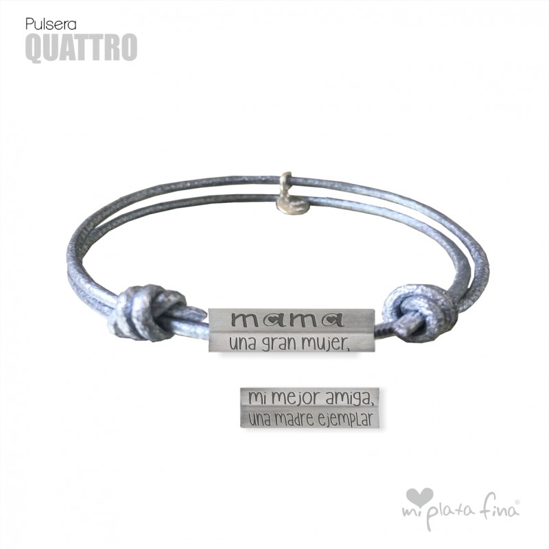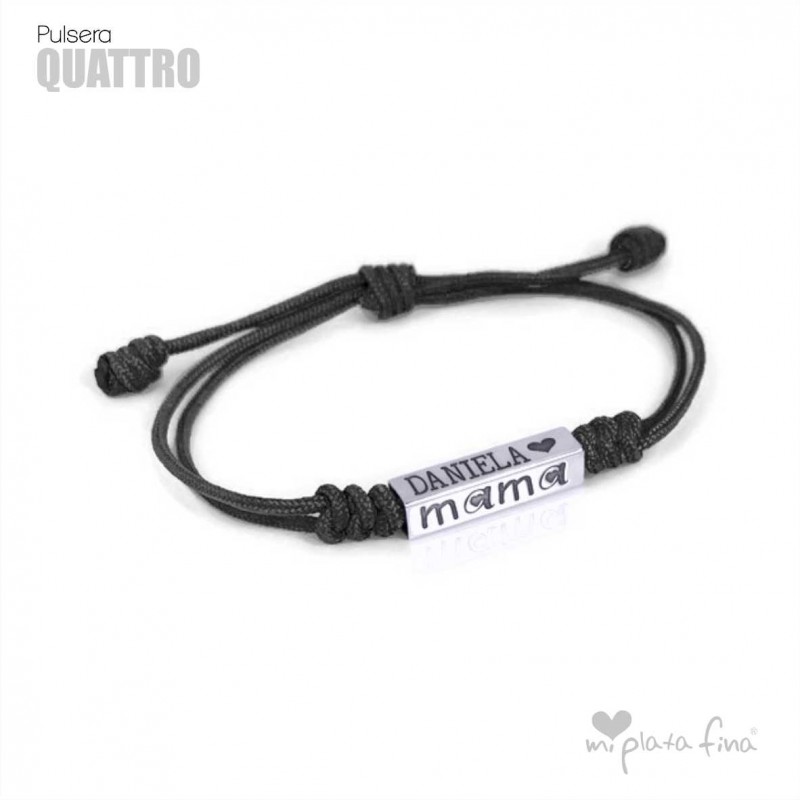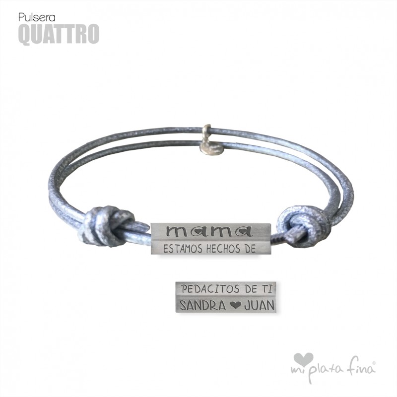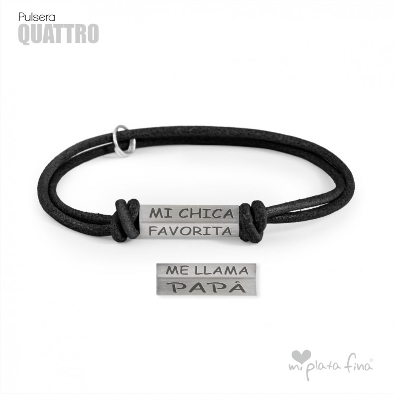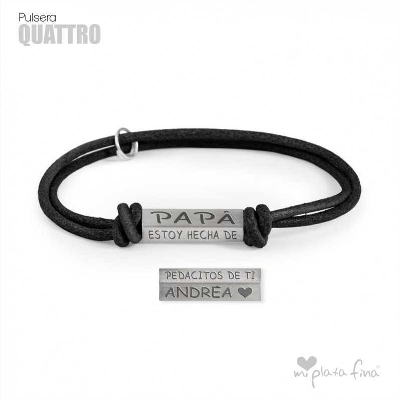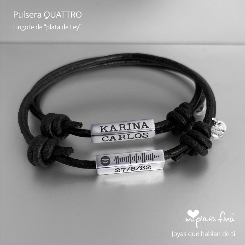 Bracelet silver cube of 20x5mm with leather lace which fits to any size and personalised at the 4 sides of the cube with names, phrase or symbols.