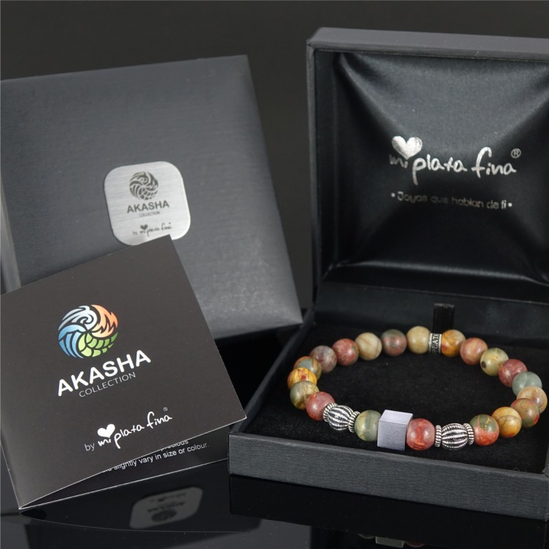 Bracelet with 8mm semi-precious gemstones "Jasper Picasso" with a 8x8 mm silver's bead engraved on the 4 sides, 2 silver round beads and 1 silver's circle hoop with Mi Plata Fina's brand.