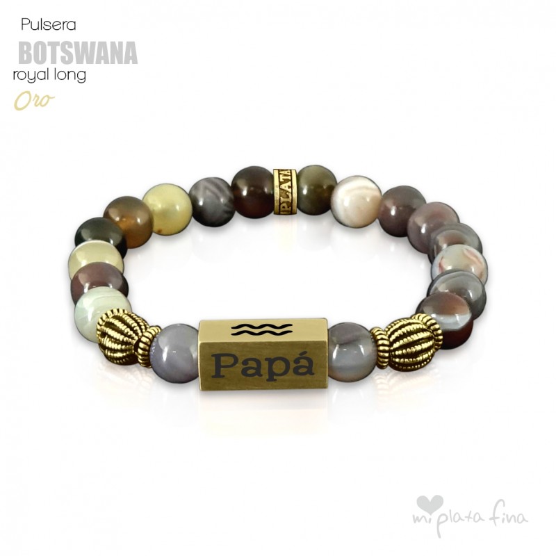 Pulsera con piedras semipreciosa Ágata Botswana de 8mm, abalorio de 18x18mm para grabar en sus 4 lados, 2 abalorios redondos de 8mm y aro con logo Mi Plata Fina, todo en Plata de Ley con baño de ORO de 18 kilates.