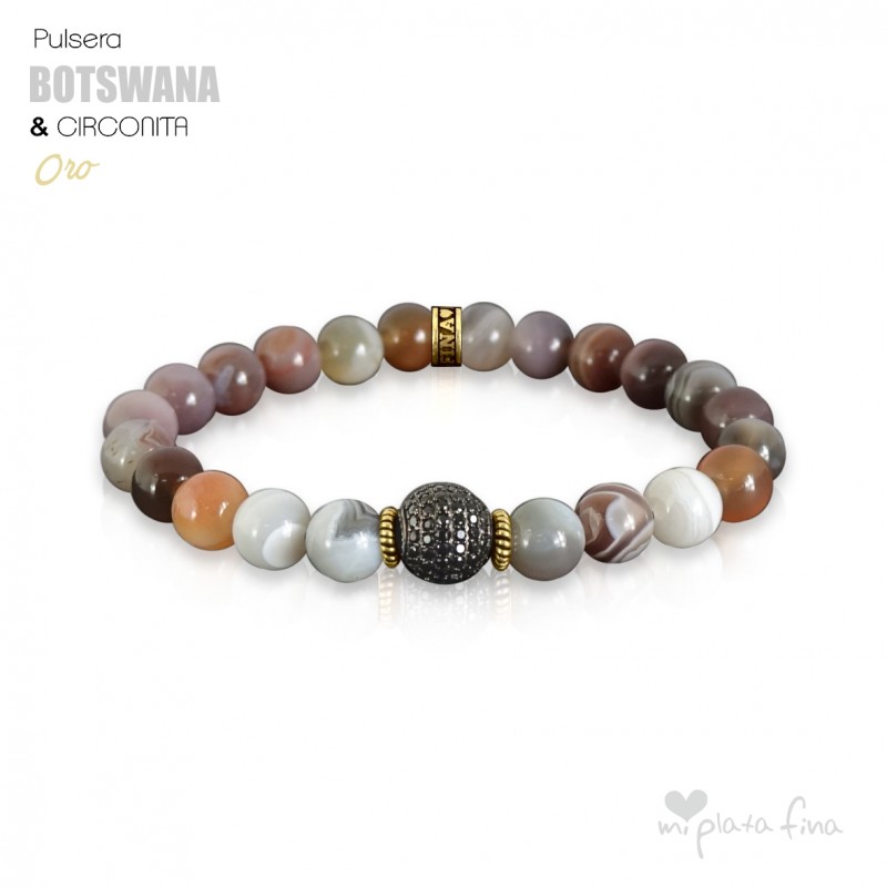 Pulsera con perla recubierta de brillante pavé de CIRCONITAS negras de 10mm + Piedras Semipreciosas Ágata Botswana de 8mm y aro con logotipo Mi Plata Fina en Plata de Ley con baño de ORO de 18 kilates.