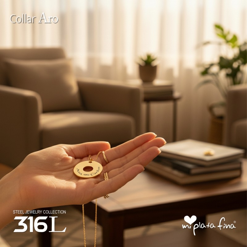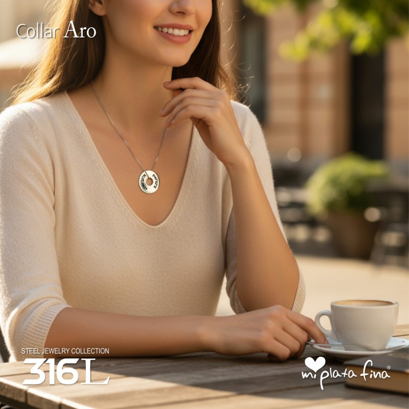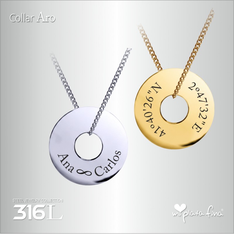 Collar ARO con cadena regulable 50/60cm.Lleva a quien más quieres cerca del corazón. Este collar permite grabar Fotos, Dibujos o Mensajes con máxima definición.