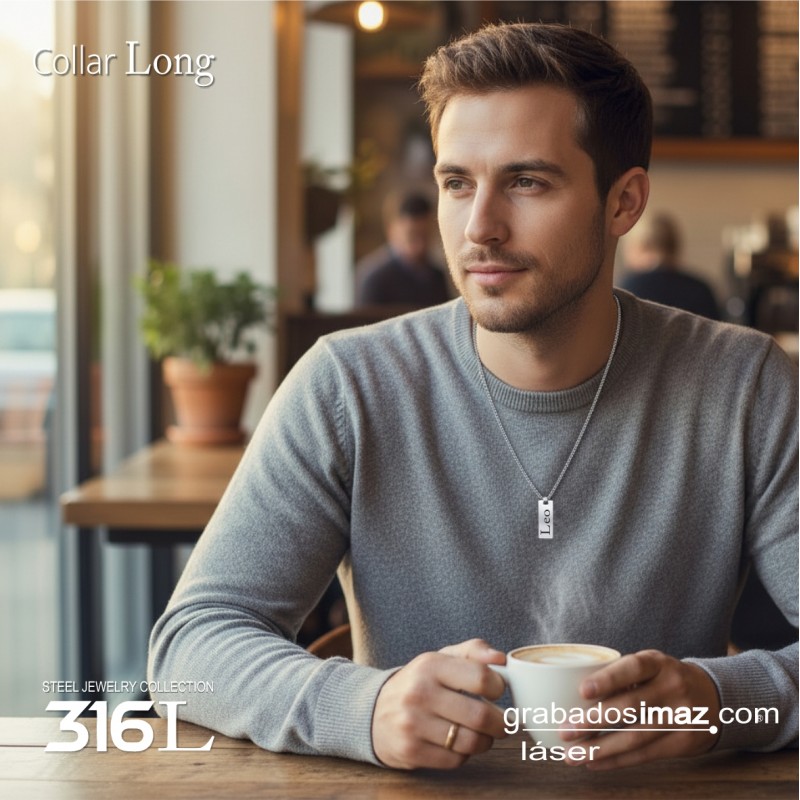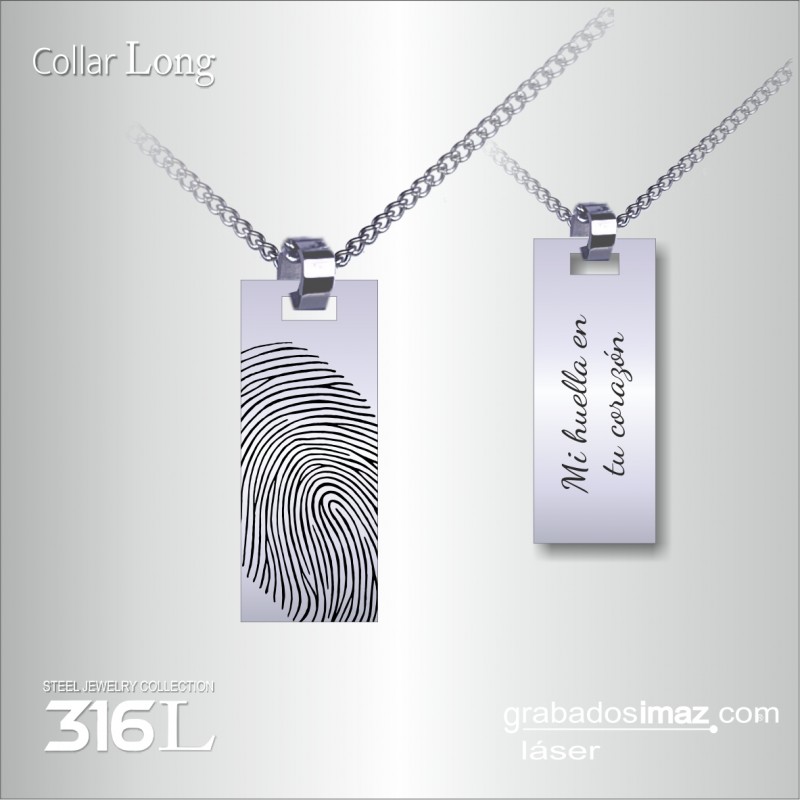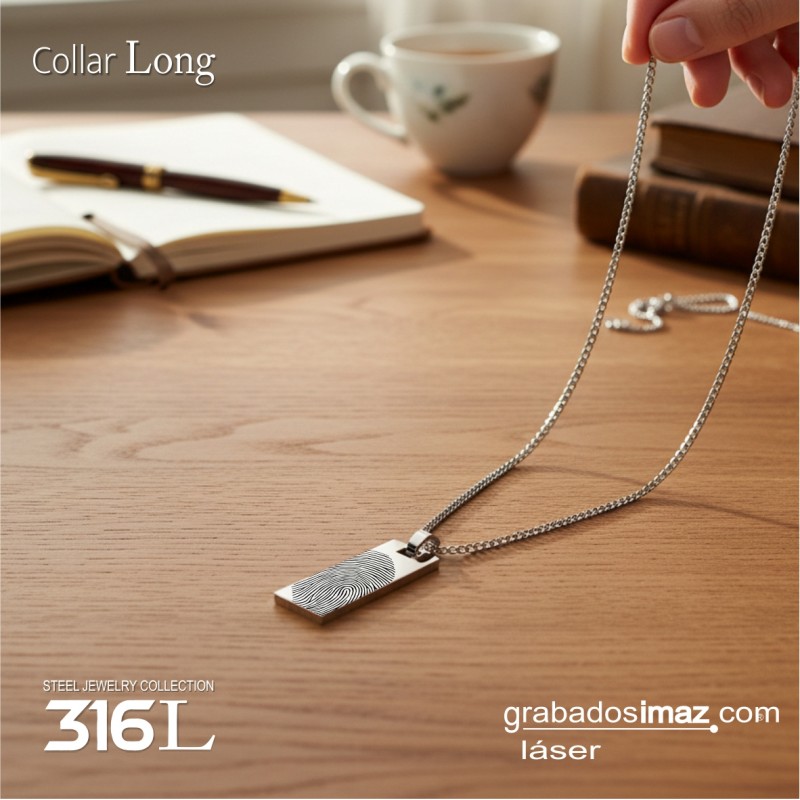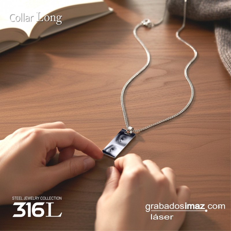 Collar LONG placa rectangular de 25x10mmcon cadena regulable 50/60cm. Lleva a quien más quieres cerca del corazón. Este collar permite grabar Fotos, Dibujos o Mensajes con máxima definición.Fabricado en Acero 316L (Quirúrgico)PVD, la mejor calidad en joyería: