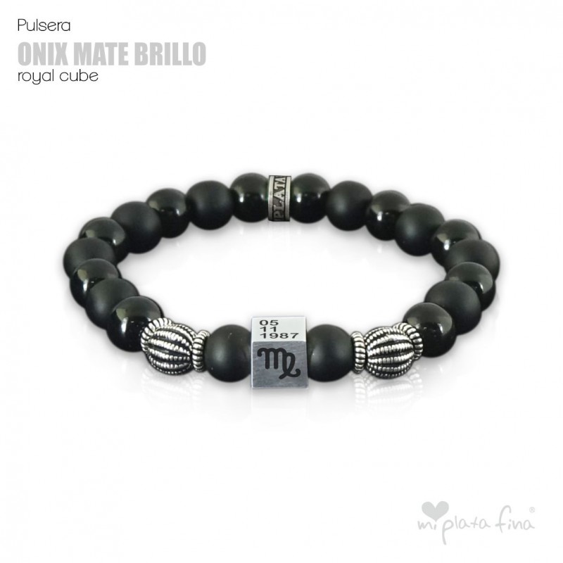 Pulsera de onix brillo-mate de 8mm + abalorio de 8mm x 8mm para grabar en sus cuatro lados, dos abalorios redondos de 8 mm. y aro con logotipo Mi Plata Fina, todo en Plata de Ley
