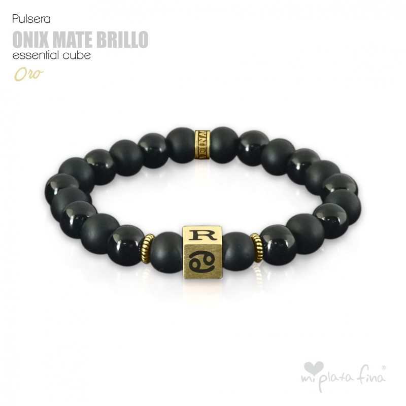 Pulsera de onix brillo-mate de 8mm + abalorio de 8mm x 8mm para grabar en sus cuatro lados y aro con logotipo Mi Plata Fina, todo en Plata de Ley con baño de ORO de 18 kilates.