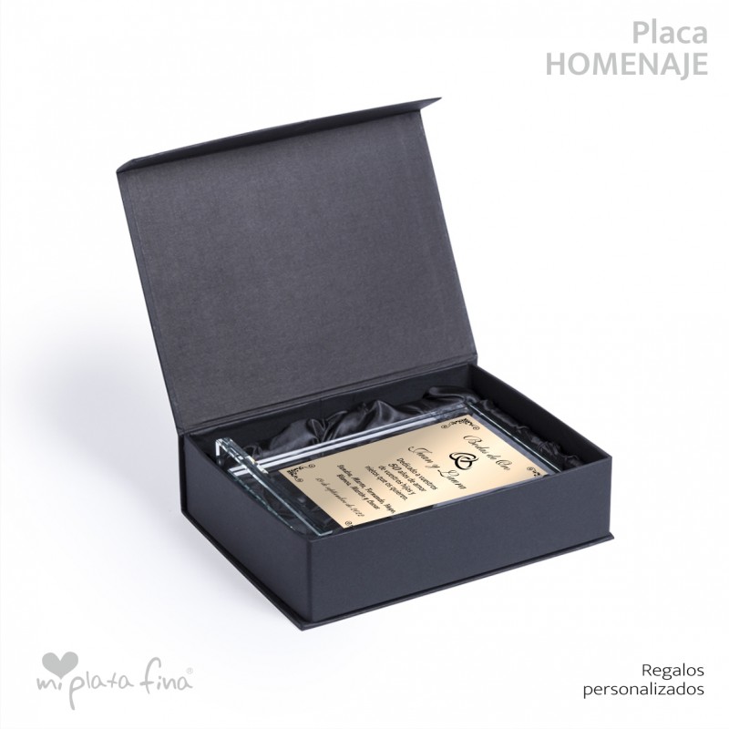 Placa HOMENAJE trofeo de cristal con elegante diseño rectangular con peana y estuche luxury.